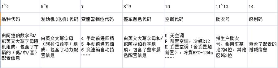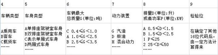3.车辆指示部分---VIN最后一部分,由八位字码组成,且最后六位是纯数字,字码含义如下。