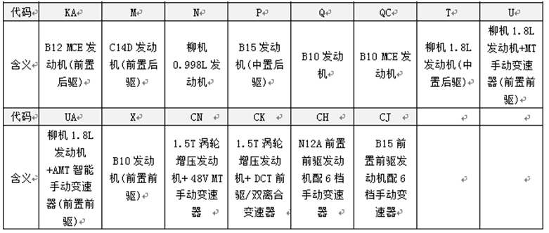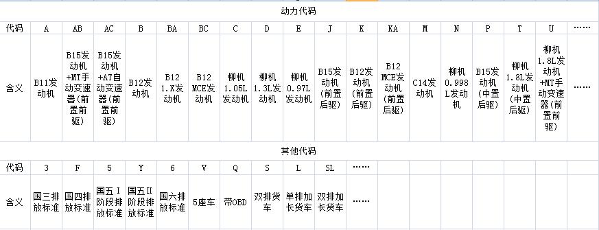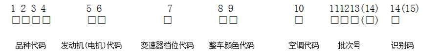 VSN码由品种代码、发动机(电机)代码、变速器档位代码、整车颜色代码、空调代码、批次号、识别码组成。