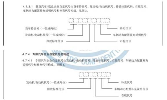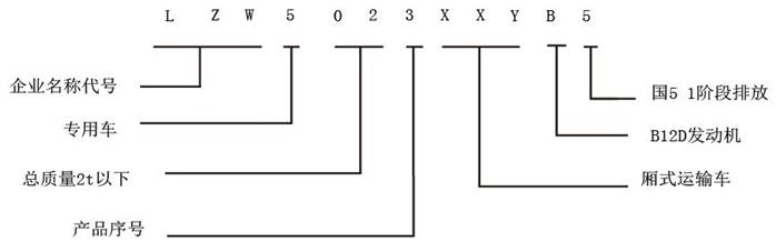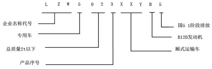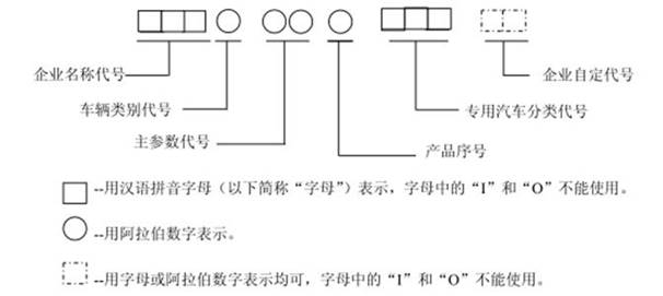 车辆型号由企业名称代号、车辆类别代号、主要参数代号和产品序号组成,专用汽车还应增加 专用汽车分类代号,必要时附加企业自定义代号,如下图。