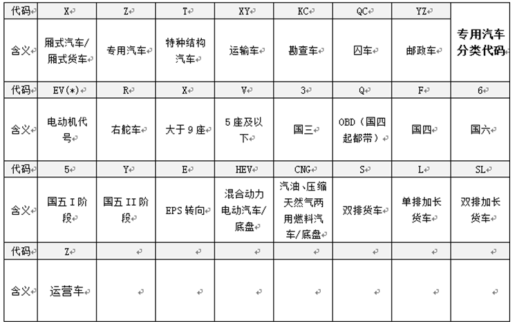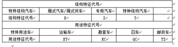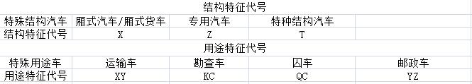 4.专用汽车分类代号---用反映车辆结构(一位)和用途特征(两位)的三个汉语拼音表示,如下。