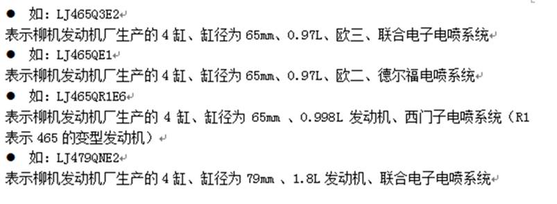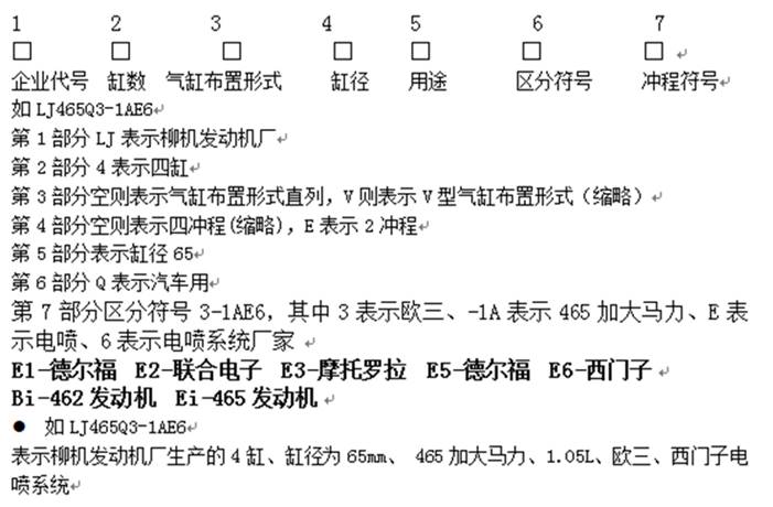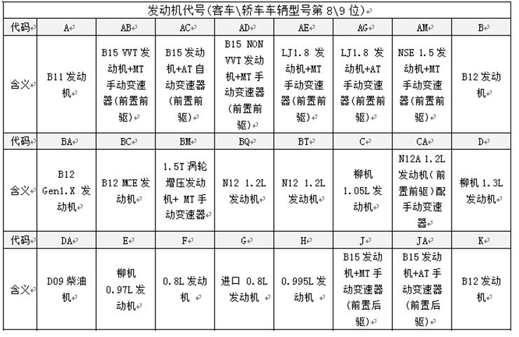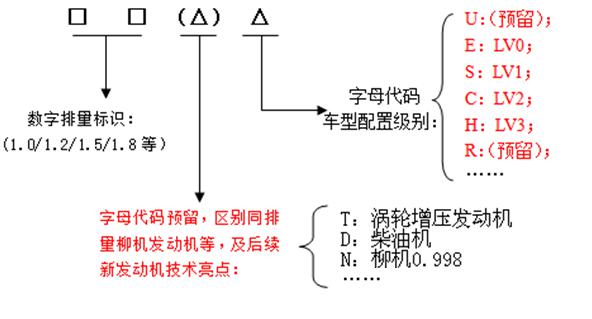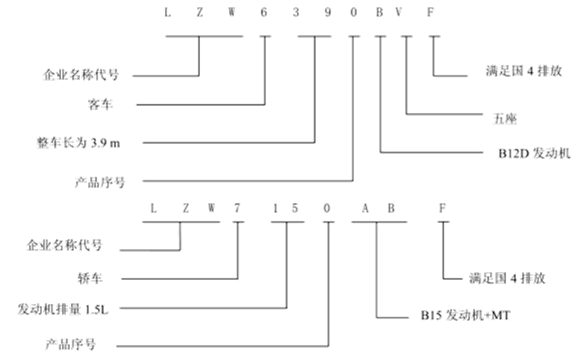 ③ 轿车:主要参数代号为发动机排量(单位:L),精确到小数点后一位,并以其值的十倍数值表示,纯电动轿车为“00”。