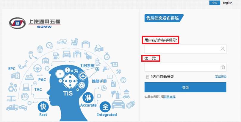 SGMW EPC在2015年起已正式更新为Web网页版(2015年前为客服端安装版),实现了配件信息在服 务器上的同步更新与发布,各服务站将不再需要每月单独升级。EPC及各关联子模块统一集成在售后 信息发布系统中,采用账号(用户名)和密码的登录方式,初始访问界面如下: