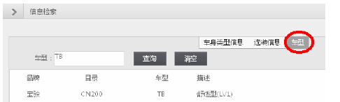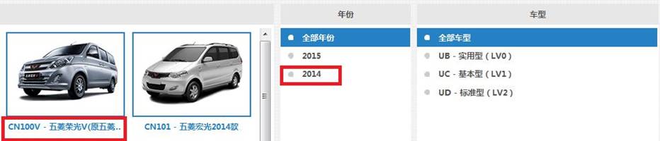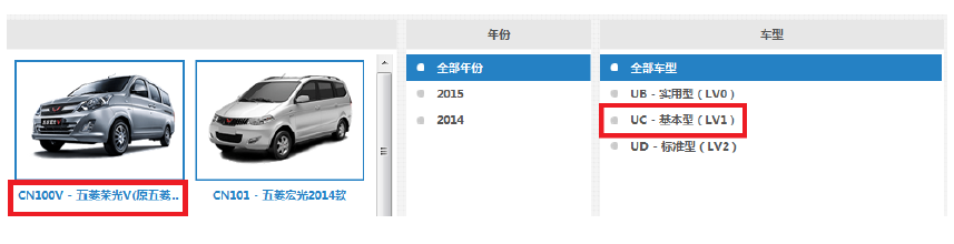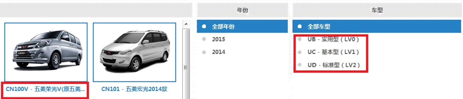 2.车系-年份-车型:选中某一车系(如CN100V),再选择该车系下某一生产年份(2014),即可看 到具体车型(即通常所说的 低-实用型UB/中-基本型UC/高-标准型UD 配置),也可直接选择全部年份 ,则是对应选择了全部年份/车型。