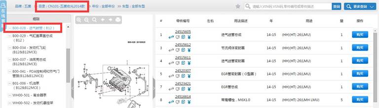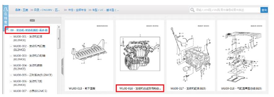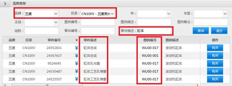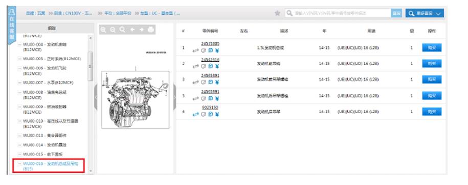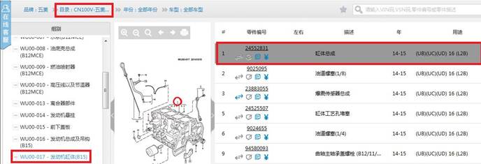输入想要查询的车型(如CN100V)和要查询零件的关键描述(如缸体),点击查询,即可快速搜索出相关的EPC零件图例和数据信息, 待确认所需的零件信息后,点击相对应的图例编号(如 WU00-017)即可进入该车型图例的主信息界面: