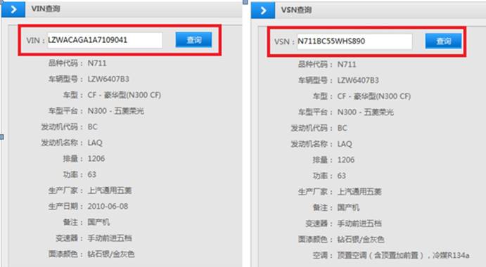 ①.VIN/VSN查询---更准确的知晓每一辆的配置状态(车辆型号、车型、车系,动力属性、面漆颜色、空调配置),为下一步故障 车辆零配件的查找工作提供了重要基础信息,建议服务站充分利用此功能,可有效避免找错零部件,如下: