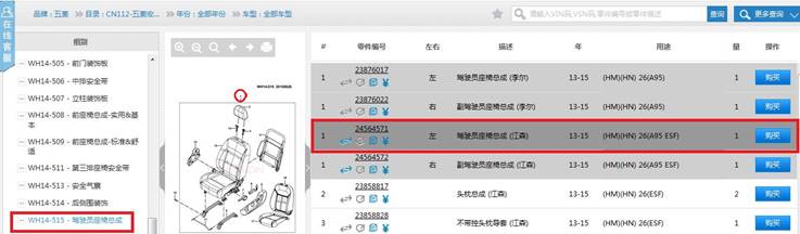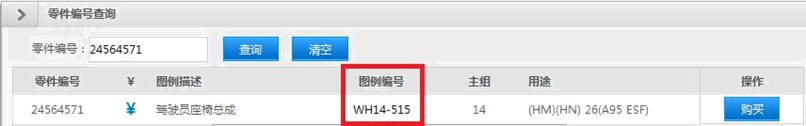 输入待查找的零件编号(如24564571),并单击上图中“图例编号WH14-515”,即可进入所查询零件的图例用法信息主页面。