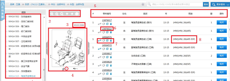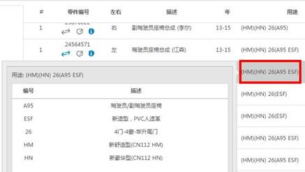 5.零件用途详情---包含序号、零件编号、左右标志、零件中文描述、零件用法年份、零件用途详情(车型代码/选装代码)、数量、操