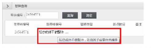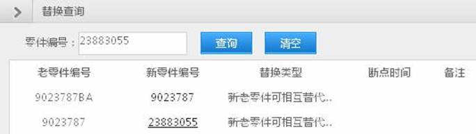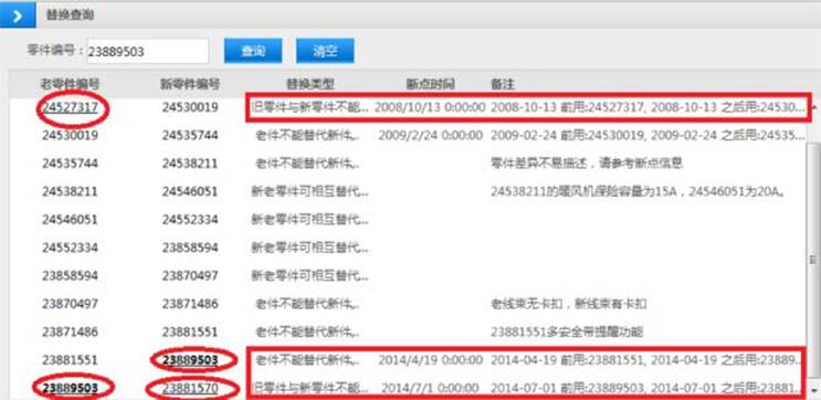 ⑤替换查询---查询历史数据及当前EPC数据相关零配件的替换和备注信息,其中无下划线的零件号表示不在当前EPC版本数据中, 一般均为历史配件,暂时不支持订购,但仍然能查询其相关替换信息,如下。