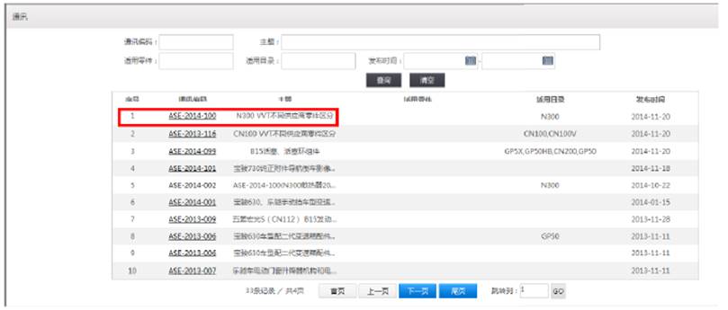 配件通讯模块主要是发布售后各类工程通讯,主要是售后工程科针对部分疑难问题(如多供应商配 件难区分)发布的专业指导信息,服务站通过及时查阅这些资料,可以更有效的指导售后配件订购 和汽车维修工作。