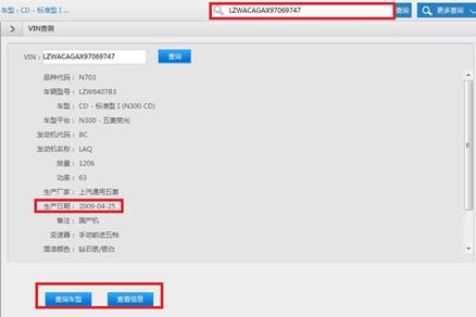 通过EPC的VIN查询功能,输入VIN码,用于解析车辆基本配置信息,如车辆型号,适用车系 ,发动机型号等;生产日期(2009-04-25)用于零件的生产断点时间查询。