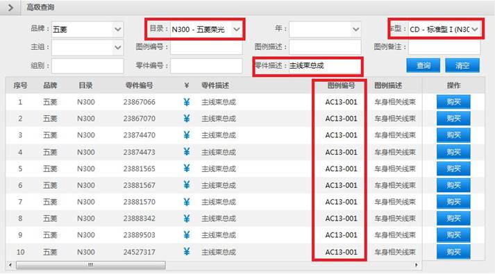 无论是方法1还是方法2,最终都是为了锁定目标配件(主线束总成)所在的关联图例(AC13-001),为下 一步正确配件号的甄别筛选做准备。