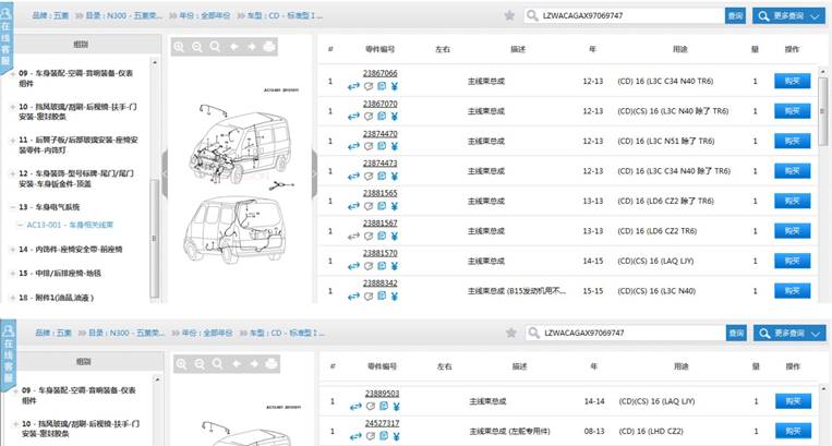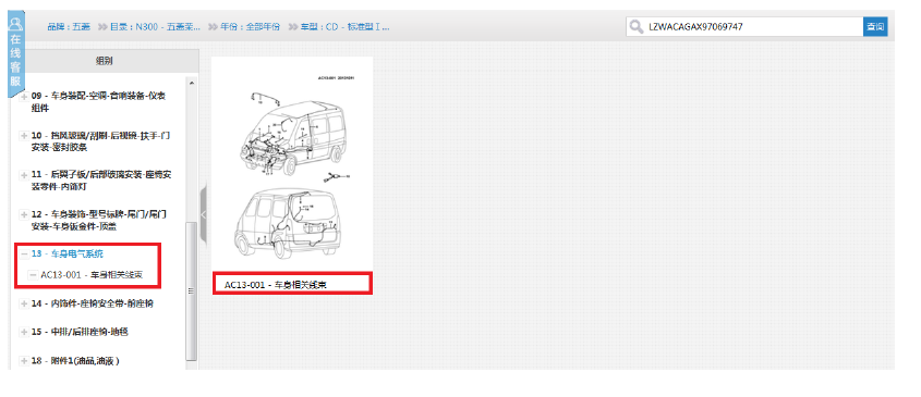 2.熟悉EPC图例分组---点击“查看信息”,可直接定位到品牌(五菱)→车系(N300五菱荣光)→年份(全部年份) →车型(CD-标准型 Ⅰ) ,然后搜索图例主组13(车身电气系统),即可定位目标配件所在的主图例号为AC13-001 :
