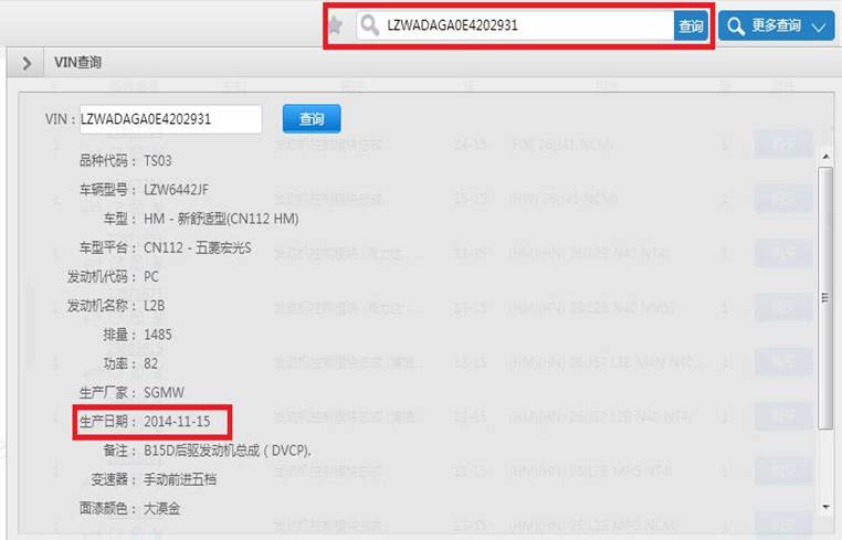 n 步骤一:通过EPC的VIN查询功能,解析出该车辆的相关基础配置信息和生产日期2014-11-15。